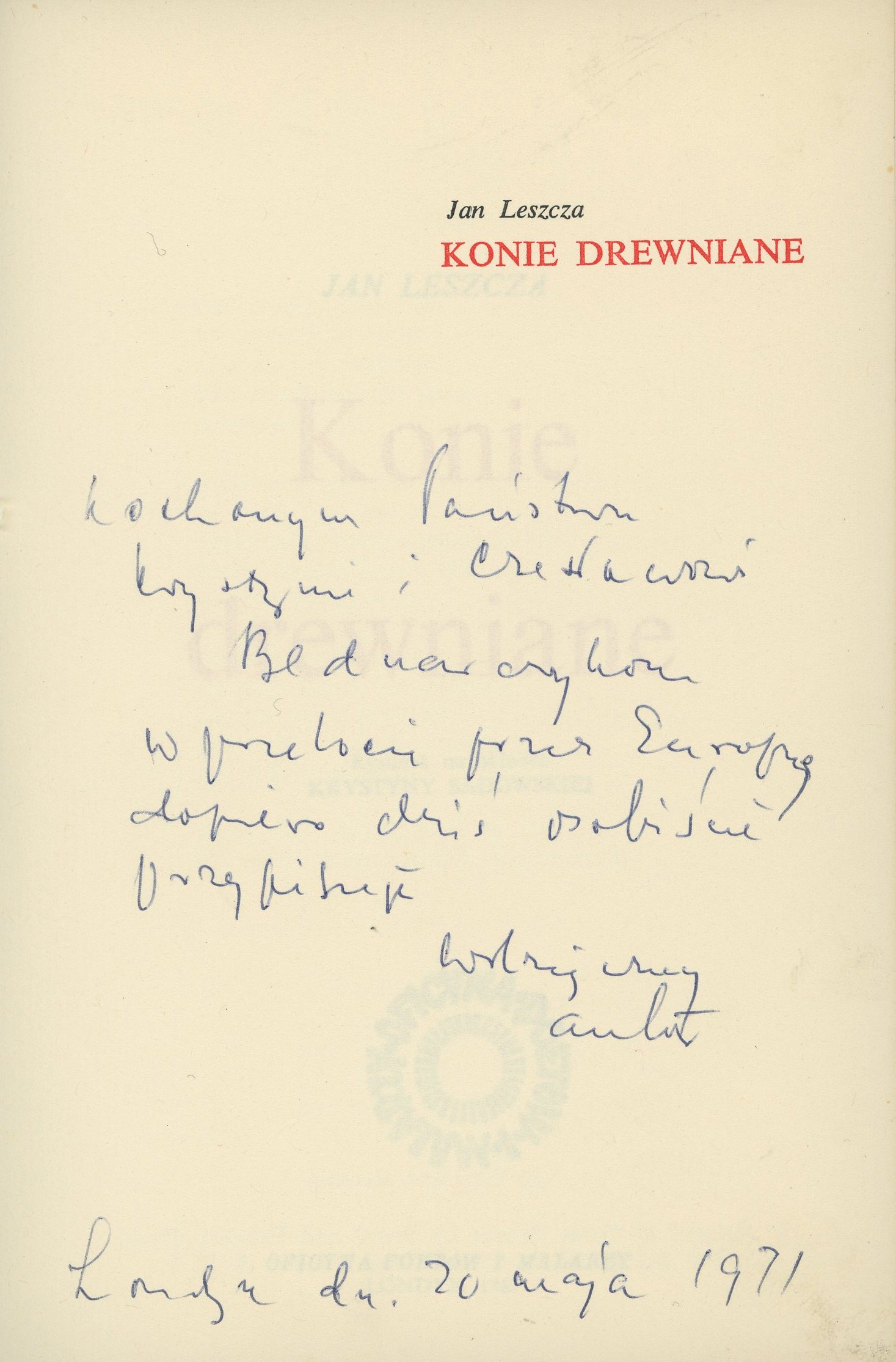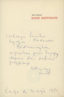 Kochanym Państwu, Krystynie i Czesławowi Bednarczykom w przelocie przez Europę dopiero dziś osobiście przypisuję, wdzięczny autor, Londyn dn. 20 maja 1971
