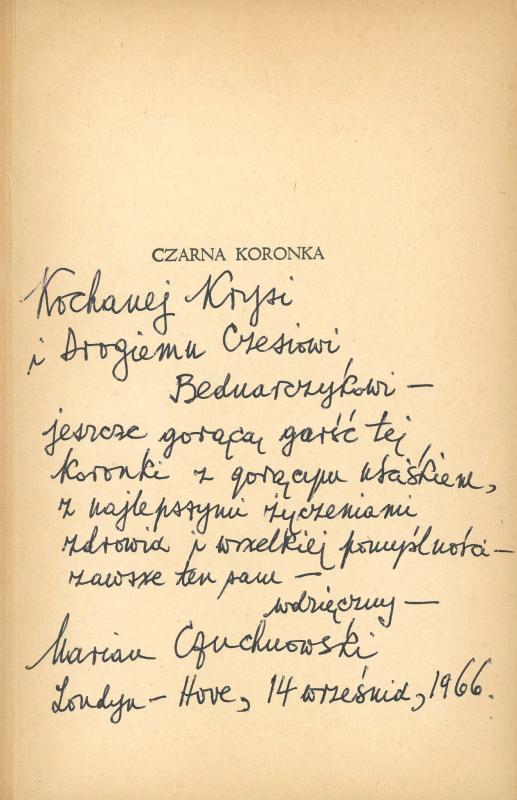 Kochanej Krysi i Drogiemu Czesiowi Bednarczykowi ‒ jeszcze gorącą garść tej koronki z gorącym uściskiem, z najlepszymi życzeniami zdrowia i wszelkiej pomyślności ‒ zawsze ten sam ‒ wdzięczny ‒ Marian Czuchnowski, Londyn ‒ Hove, 14 września, 1966